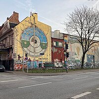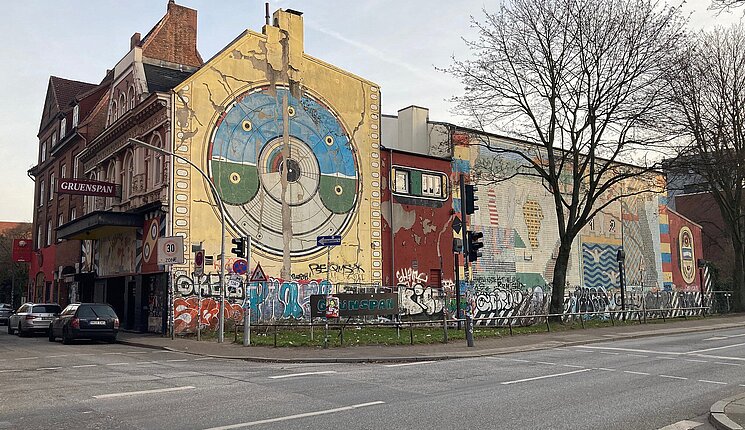 Das erweiterte Wandbild vereint die klar unterscheidbaren, zugleich aufeinander bezogenen Handschriften der beiden Künstler. Die geometrisch-abstrakte, politisch reflektierende Bildsprache Werner Nöfers trifft auf die spielerisch-poetische, figürliche Malerei Dieter Glasmachers, in der erzählerische Elemente und menschliche Figuren immer wieder auftauchen. Die Komposition wirkt wie eine Collage, die sich vertikal durch das Werk zieht. Sie spiegelt zugleich die Vitalität, die Vielfalt und den stetigen Wandel des Stadtteils St. Pauli.